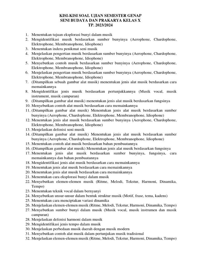 Mata pelajaran Seni Budaya di kelas X semester 1 biasanya mencakup pengenalan dasar-dasar dari empat domain seni: Seni Rupa, Seni Musik, Seni Tari, dan Seni Teater. Materi yang diajarkan meliputi konsep, teknik dasar, sejarah singkat, dan apresiasi. Oleh karena itu, penyusunan soal harus mampu mengukur: